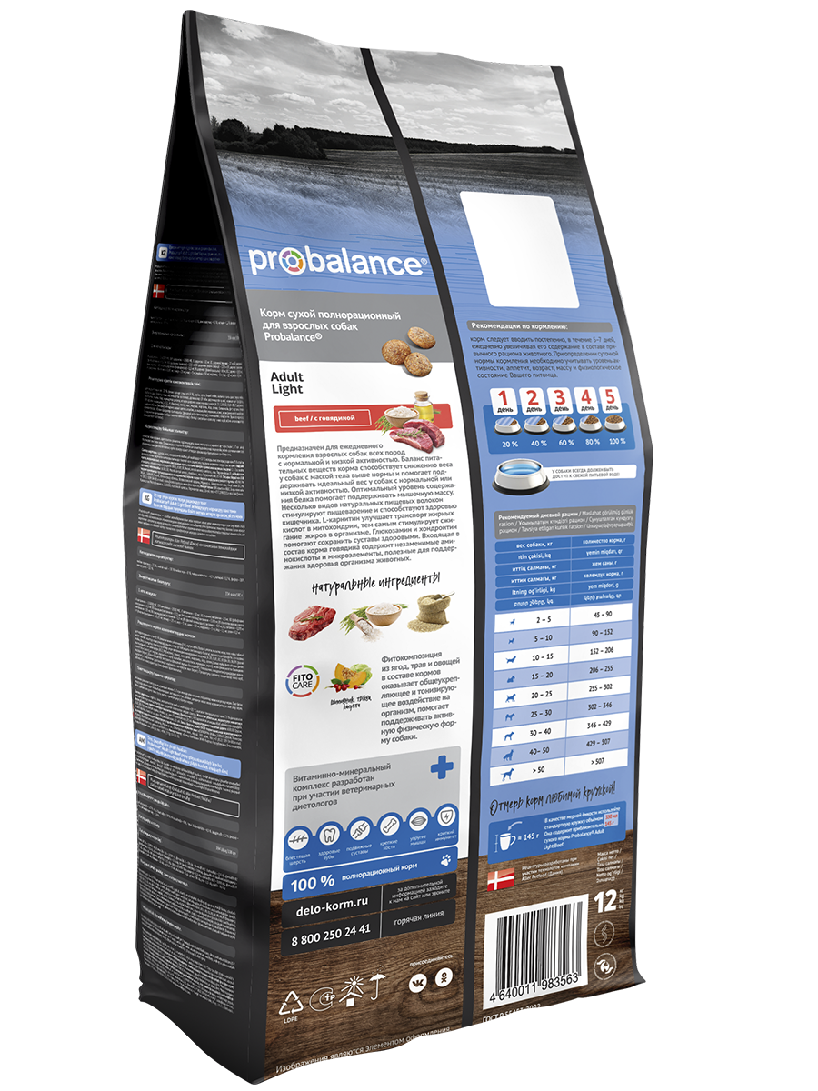 Корм Probalance Adult Light помогает снизить лишний вес у собак с массой тела выше нормы и поддерживать идеальный вес у питомцев с нормальной или низкой активностью.