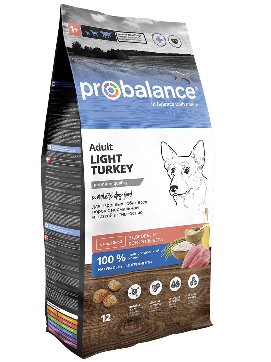 Сухой корм Probalance Adult Light с функцией контроля веса подходит для питомцев с лишней массой, малоподвижных или склонных к полноте. Рацион рекомендован для ежедневного кормления взрослых собак всех пород. 100% сбалансированный состав – только натуральные продукты без Е-консервантов.