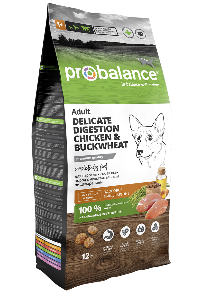 Probalance Delicate Digestion – натуральный сухой корм премиум класса для собак с курицей и гречкой. Рацион отличается от обычных кормов: он относится к сбалансированному питанию, рекомендованному для животных с чувствительным желудком, а также выступает, как профилактика нарушений пищеварения. Корм подходит для ежедневного кормления взрослых собак всех пород.